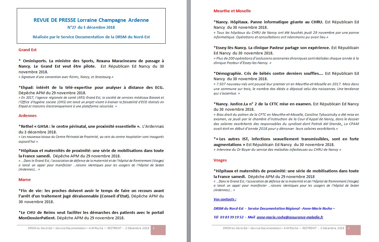 Depuis mai 2018, le service documentation compile chaque semaine toutes les actualités générales et médicales de la Champagne-Ardenne et de la Lorraine dans un sommaire d’articles. Cette revue des sommaires est envoyée à une liste de destinataires de décideurs internes. Elle leur permet de suivre et d’avoir une vue d’ensemble des nouveautés et des actions locales et régionales, nécessaires à leur activité et leur prise de décision.